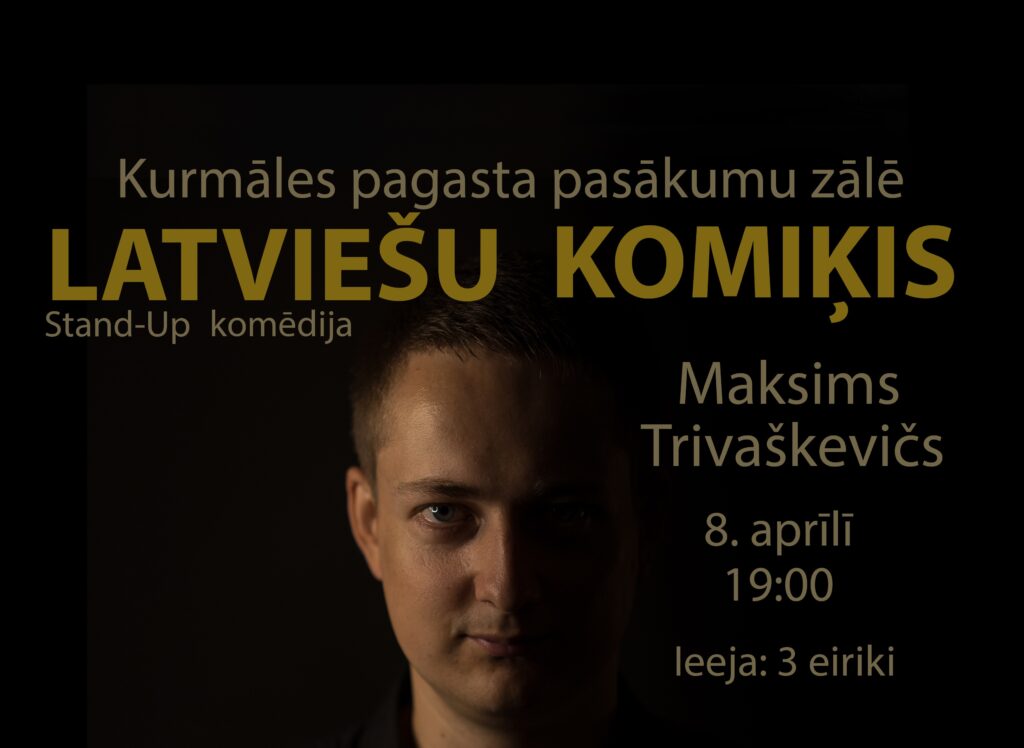 Piektdien, 8.aprīlī Stand- Up komiķis Maksims Trivaškevičs Kurmāles pagasta pasākumu zāles viesus iepriecinās ar soloprogrammu „Latviešu komiķis”, kura 2019. gada novembrī piedzīvoja pirmizrādi, un tās ietvaros autors stāstīs savus jaunākos labākos jokus.